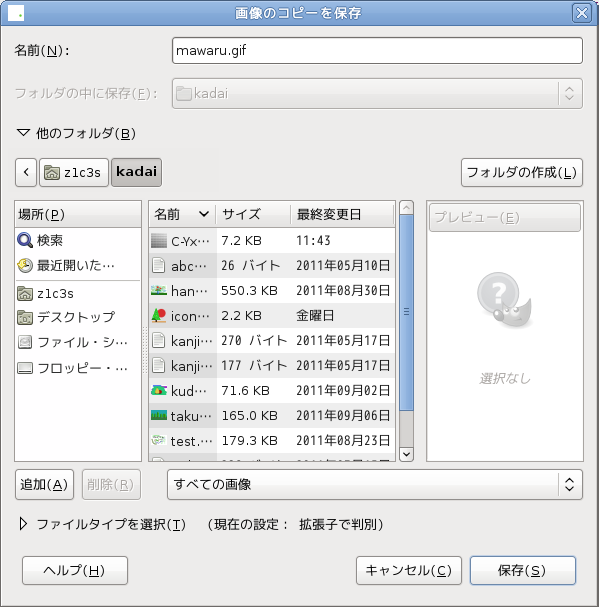 「名前をつけて保存」または「コピーを保存」で、やはりkadaiの中にanime1.gifという名前で保存すること。