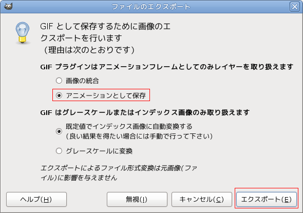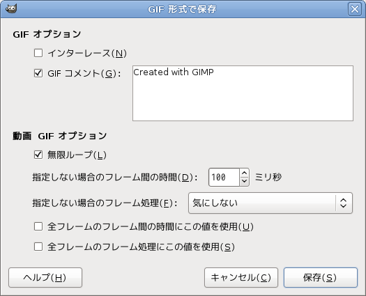 xcfの他にgif形式で保存すればGIMPを持っていない人でもアニメーションを見ることができます。(gifは256色しか使えないなど制約が多いのでオリジナルのxcfは必ず残しておくことをおすすめします)
