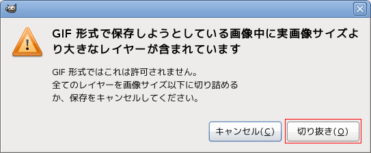 今回描いたアニメは、レイヤーをずらして動きを表現したため、画像の領域からはみ出しているレイヤーがあります。gifはこれを切り捨ててしまうがよいかと聞いています。今回はまったく構わないので[切り抜き]をクリックします。