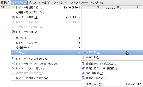 水平反転は[画像]のメニューでなく[レイヤー]メニューからのものを使います。