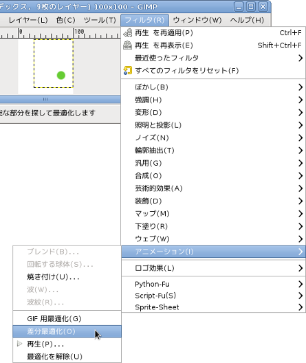 GIMPのメニューバーから[フィルタ]-[アニメーション]-[差分最適化]をするとアニメーションに不要な部分を消し去ったデータを作ります。