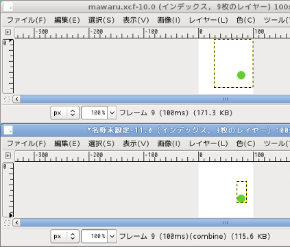 上が元になったmawaru.xcf。下が最適化されたものです。見た目は代わりませんがレイヤーダイアログを見るとわかります。