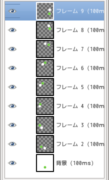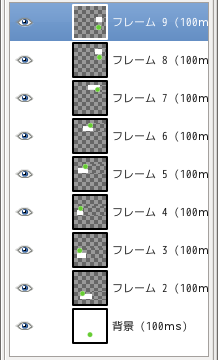 レイヤーダイアログをみると、一つひとつのレイヤーが、前のコマと次のコマの異なる部分だけが抽出されています。レイヤーを一つ重ねると前の画像と異なる部分だけがこのレイヤーで隠されて次のコマになるようになっています。異なる部分を抽出することを「差分をとる」といいます。