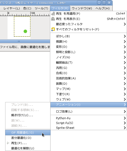 GIMPのメニューバーから[フィルタ]-[アニメーション]-[GIF用最適化]をするとアニメーションに不要な部分を消し去り、GIF用に色数を落としたりGIF形式にした時にデータ量が少なくなったり表示が速くなるように最適化したデータを作ります。