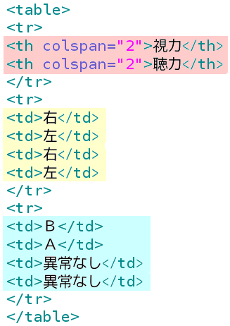 これを実現するためには、視力と聴力のセルを作るth(またはtd)タグに <th colspan="2"> と記入します。そして1行目のセルは2つだけにします。colspan の後ろの数字は結合させるセルの個数です。