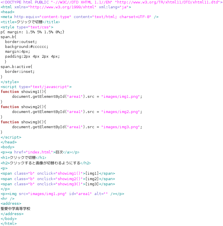 <p> <span onclick="showimg1()">[img1]</span> <span onclick="showimg2()">[img2]</span> <span onclick="showimg3()">[img3]</span> </p> <p> <img src="images/img1.png" id="area1" alt="説明図" /> </p>