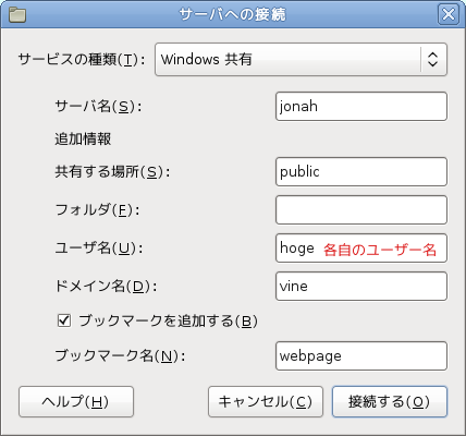 windows共有を選んで次のようにします。hogeの部分は各自のユーザー名を入れます。