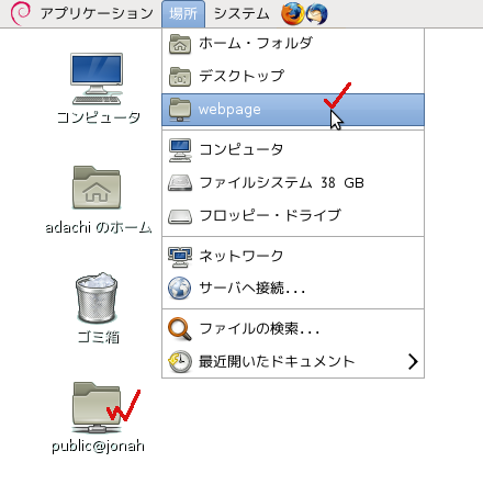 デスクトップにリンクができています。次からはここをダブルクリックするか、先ほどのパネルのメニューの[場所]のメニューの中にはブックマークができているはずです。