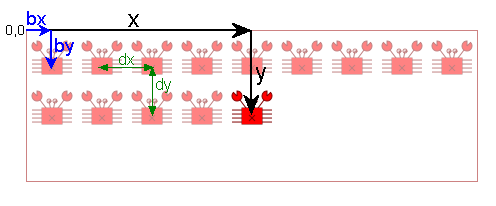 基点の(bx, by)にdx,dyの整数倍をかけて、描画位置(x, y)を求めて繰り返し描いていく(drawkani())。