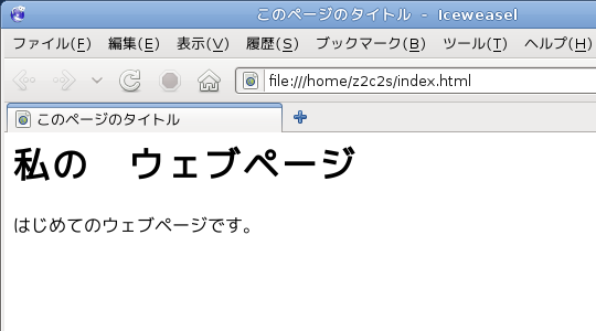<html> <head> <title>このページのタイトル</title> </head> <body> <h1>私の ウェブページ</h1> <p>はじめてのウェブページです。</p> </body> </html>