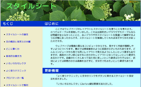 スタイルシートが十分に使えなかった時代には、テーブルやフレームで配置をすることもありましたが、現在ではこれから説明するスタイルシートを使う方法が主流です。