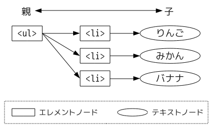 テキストノードはliタグの中に入っていることから、それぞれliタグの子ノードであると考えます。テキストノードから見てliタグは親ノードです。同様にliタグはulタグの子ノードでulタグはliノードの親ノードとなります。