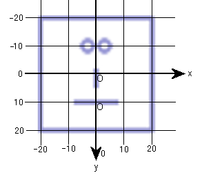 draw1kaoには、1個の絵を tx,ty を中心として描くfunctionを設計する(draw1kao(g,tx,ty))。それぞれの座標をtx,tyを加える形にしておけば、描画位置をtx,tyで指定していくつでも絵を描かせることができる。
