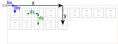 基点の(bx, by)にdx,dyの整数倍をかけて、描画位置(x, y)を求めて繰り返し描いていく(drawkao())。