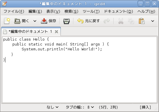 で保存します。保存の時には「名前」だけでなく「保存場所」が大切。[プログラミング]-[Java]で開いたエディタなら黙っていてもjavaというフォルダに保存されるはずですが,「フォルダの中に保存」の所に「java」とあるのを確認してください。名前には「Hello.java」と入力して保存します。LinuxではそしてJavaプログラムでは大文字・小文字の区別をしますから慣れるまでは特に注意。