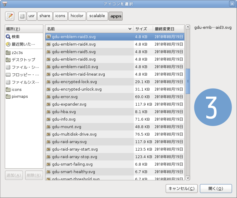 現在のフォルダである /usr/share/icons/hicolor/scalable/apps の中なら[↑][↓]のキーで画像を見ながら選択できます。