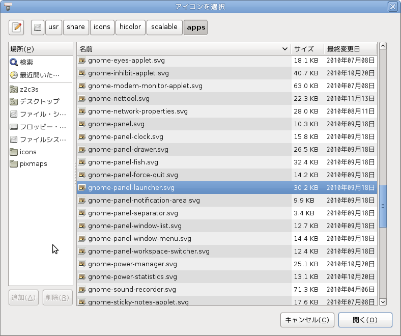 デフォルトのアイコンは、gnome-panel-launcher.svg というもので、/usr/share/icons/hicolor/scalable/apps というところにあることが画面からわかります。
