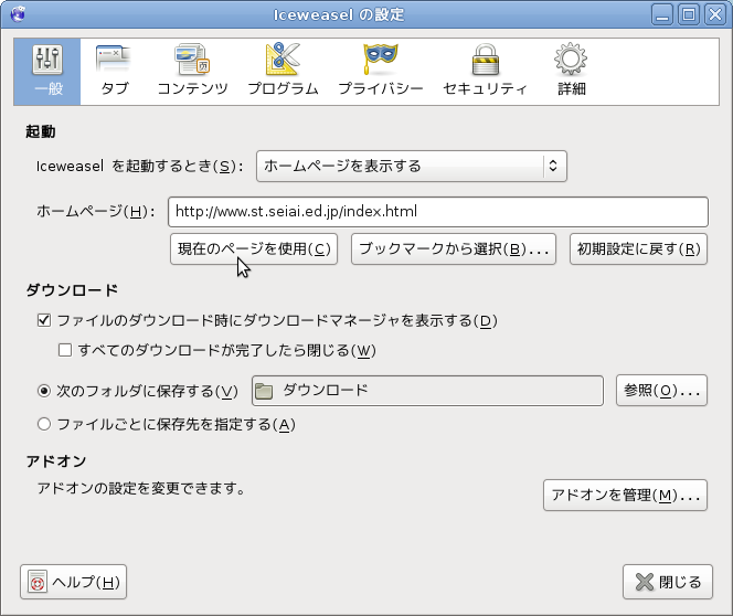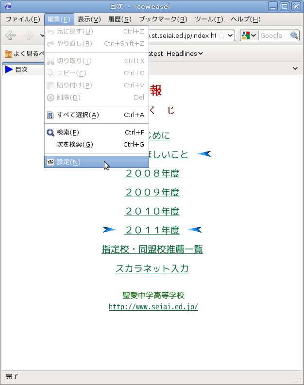 表示しているページをホームページにするには、Iceweasl(Firefox)のメニューから[編集]-[設定]とすすみ、