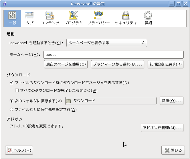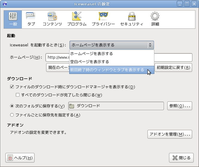 これで、再度Iceweasl(Firefox)を起動した時にはアドレスを入力することなく設定したページが表示されます。