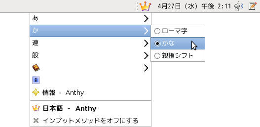 親指シフト入力方式は今のところSCIM+Anthyの組み合わせで使えます。本来はキートップの刻印が親指シフト用になっていればいいのですが、タッチタイプができるようになればJISキーボードのままでも使えます。せっかくLinuxで付加ソフト無しで使えるので後で試してみましょう。