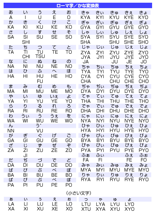 ローマ字入力の表である。一つの文字に複数の入力方法があるものもある。たいていのシステムで使える。小さい文字の入力は kitta, shunyu など他の文字と組み合わせるのが普通。LやXを組み合わせる方法は本当のローマ字表記ではなくワープロ入力だけに通用する方法である。