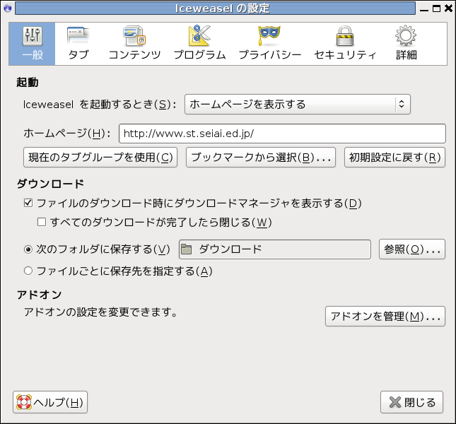ホームページは、Iceweasel(firefox)なら次のようにして指定できます。