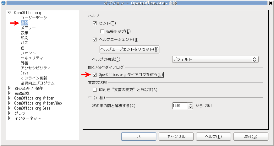 出てくるダイアログで、OpenOffice.orgの[全般]の中に、[□OpenOffice.orgダイアログを使う]という項目をセットします。