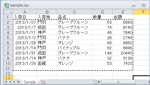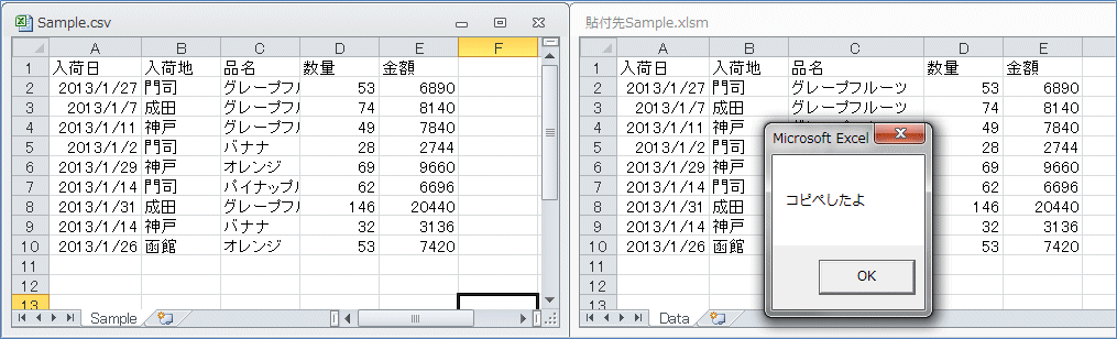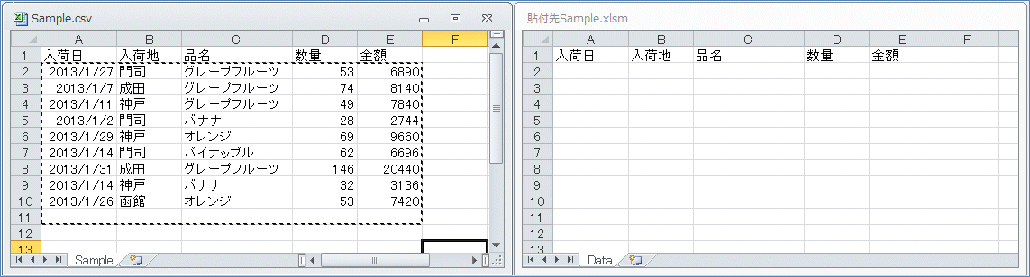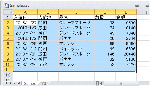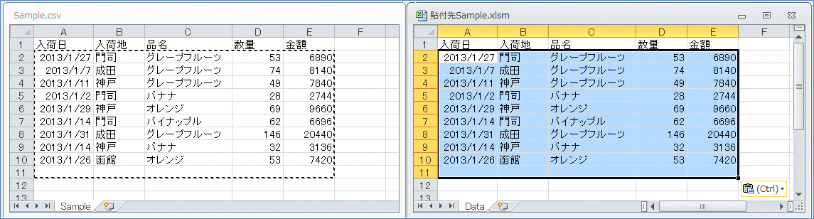 これで「Sample.csv」の1番目のシートのA1セルから繋がった範囲を1行下へ下げた範囲をコピーして