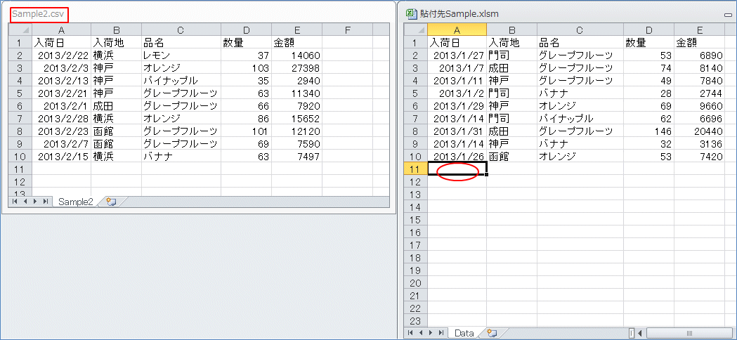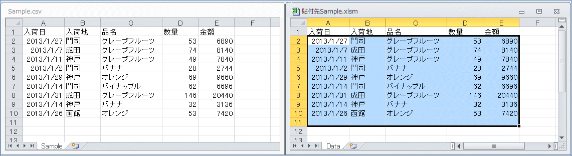 CSVデータの項目行を除いたデータ範囲をコピーして、取りこみたいブックの「Data」シートに貼り付
