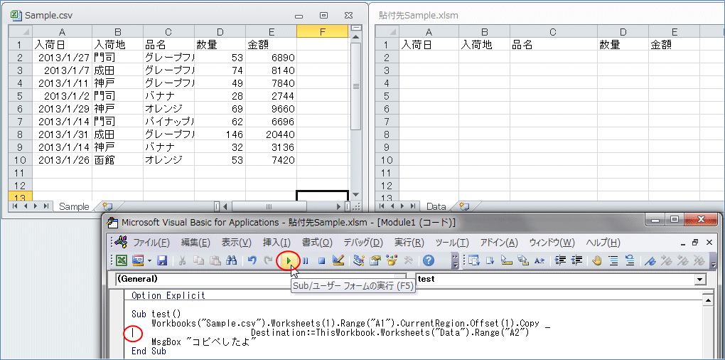 下図赤丸のように、SubとEnd Sub の間にカーソルを置いて、「Sub/ユーザーフォームの実行」ボタンを
