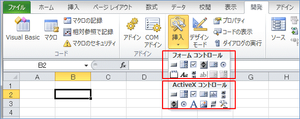 「開発」タブの「挿入」ボタンをクリックすると、フォームコントロールとActiveXコントロールの各コ
