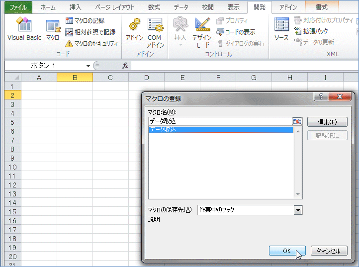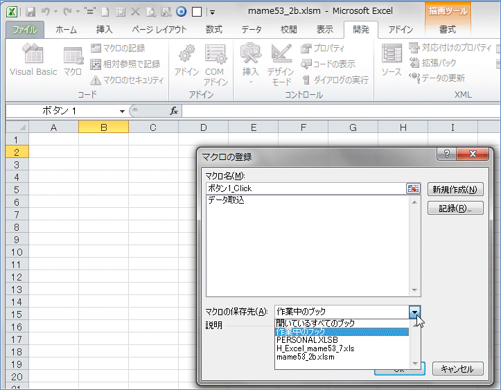 マウスをはなすと、下図の「マクロの登録」ダイアログボックスが出ます。下の方の「マクロの保存先」