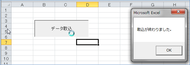 登録したマクロが実行され、メッセージが表示されました。もちろんデータもちゃんと取り込まれています。