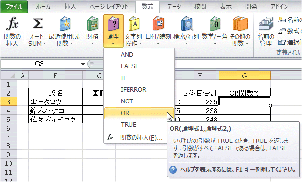 引数が2つ以上の時は「関数の挿入」ダイアログボックスを使った方がわかりやすいかも しれませんので、その方法でやってみることにします。 関数を入れたいセル(ここではG3セル)を選択した状態で「関数の挿入」ダイアログボ ックスを出します。