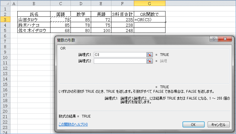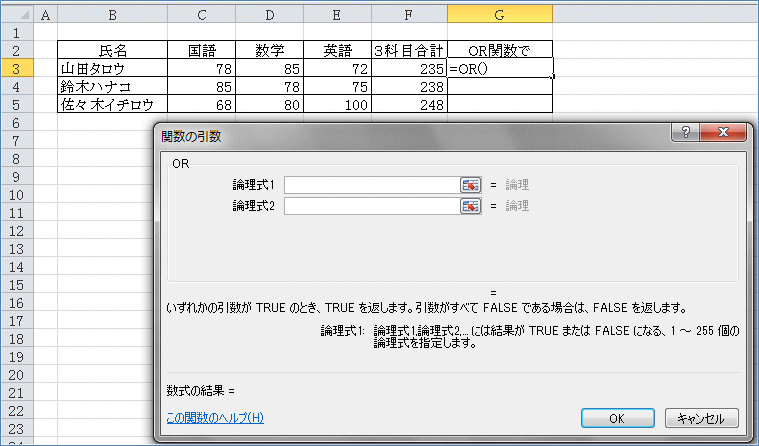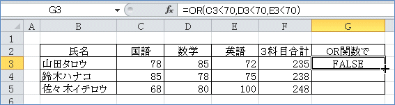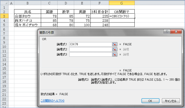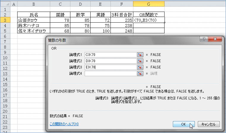同様にして、論理式2に D3<70 と入力。論理式3に E3<70 と入力。