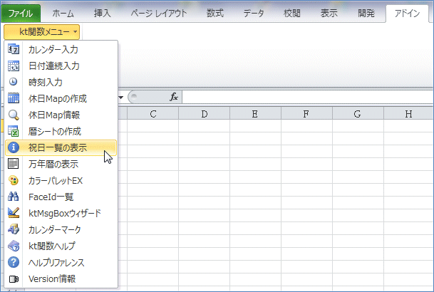 「kt関数アドイン」を使って祝日一覧を作成するやり方。 「アドイン」タブの「kt関数メニュー」の「祝日一覧の表示」をクリック。