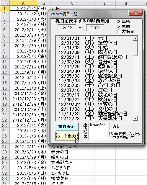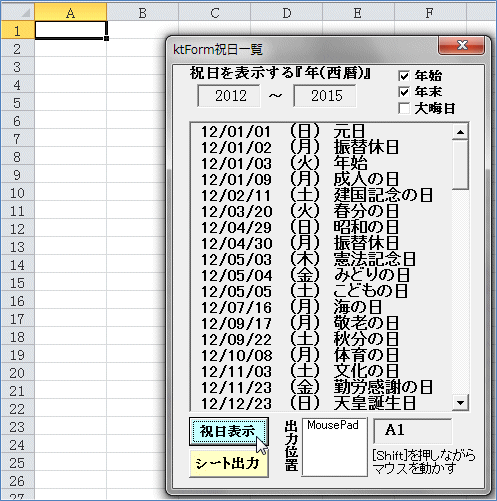 祝日を表示する『年(西暦)』を入力。「年末」「年始」「大晦日」のチェックを必要 に応じて入れて、「祝日表示」をクリックすると、下図のように表示されます。