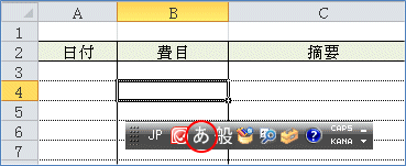 これで日付の欄を選択すると日本語入力モードが「A」の表示になり、費目の欄を選