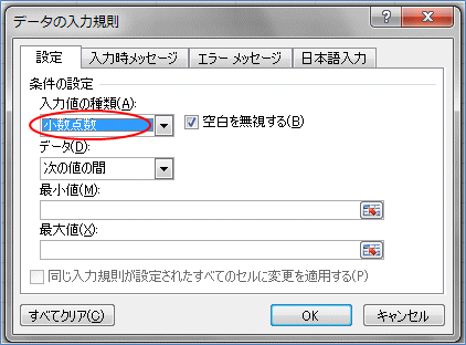 「データの入力規則」のダイアログボックスの「設定」のところでは下図のように