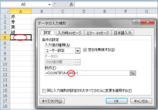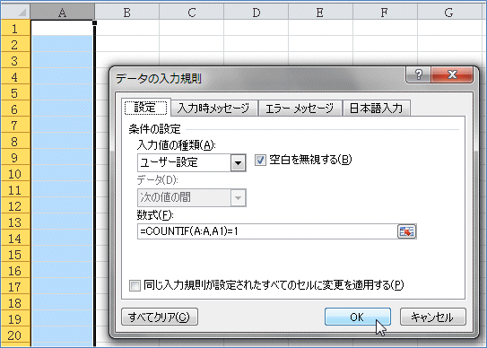 これはA列にA1セルの値がひとつの場合だけ許可という設定です。
