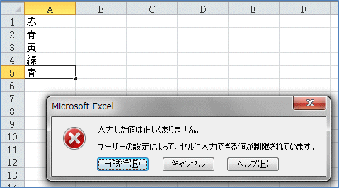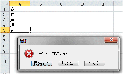 例えば、A列に値を入力していく時に、同じ値だったらエラーメッセージが出るよう