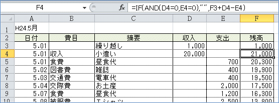 小遣い帳のF4セルから下のセルには=IF(AND(D4=0,E4=0),"",F3+D4-E4) という