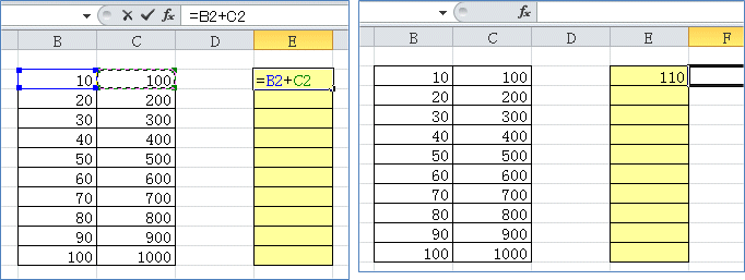 「=」を入力し、該当セルをクリック、「+」などの演算子を入力し、次の該当セ