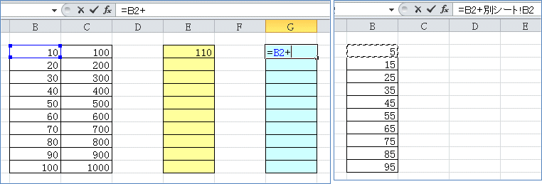 セルをクリックすると下図のように「=B4+別シート!B2」と数式バーに表示されます