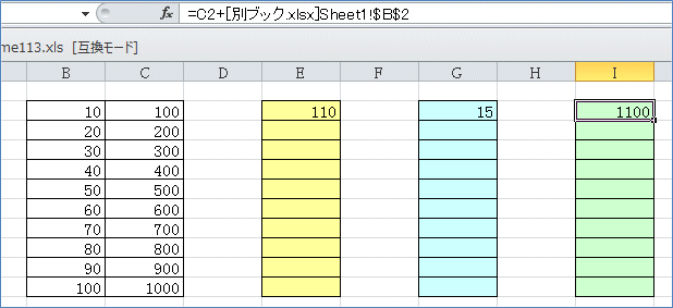 下図のように「=C2+[別ブック.xlsx]Sheet1!$B$2」と数式バーに表示されますから、Enter。