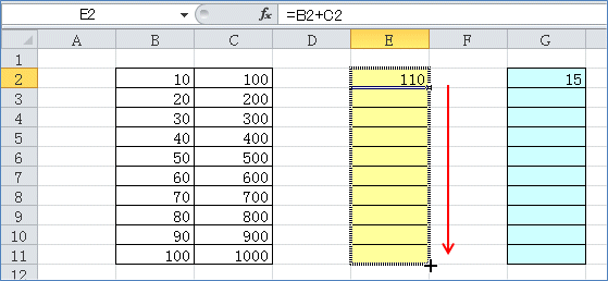 E2セルを選択し、セルの右下隅でマウスポインタが十字になったら下へドラッグします。