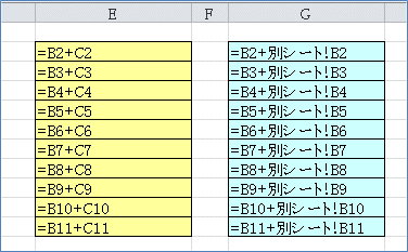 これを数式表示にしてみると、下図のようになっています。ちゃんと相対参照のコ