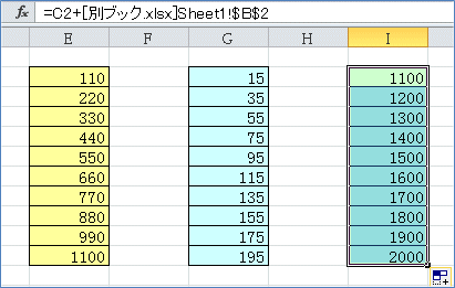 別ブックのSheet1のB2セルを絶対参照しているので、そのままオートフィルすると