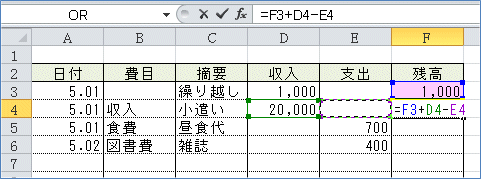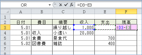 (1)残高欄の一番上のセルは「その行の収入−その行の支出」とします。 F3セルを選択し、「=」を入力、D3セルをクリックし、「−」を入力、E3セルをク リックし、Enter。