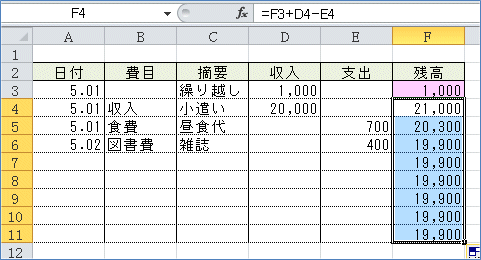 (2)その下のセルからは「前の行の残高+その行の収入−その行の支出」とします。